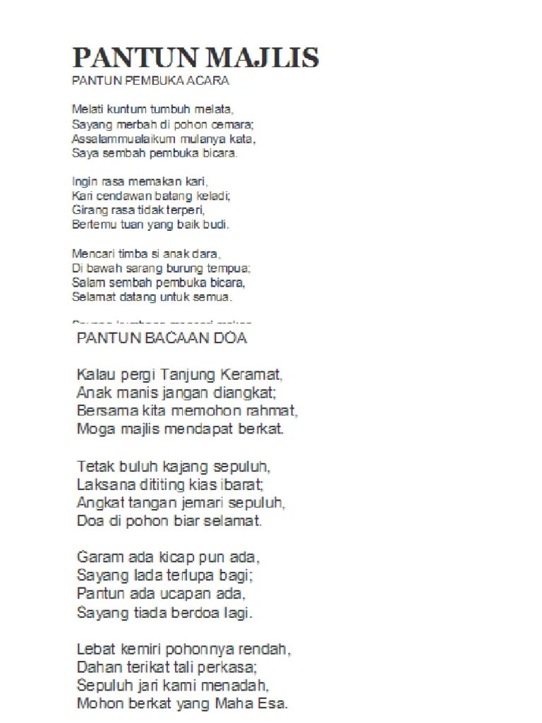 Pantun Buka Majlis / Pantun Majlis Pdf. Puisi dalam bahasa melayu larut dalam jiwa masyarakat melayu tidak hanya sebagai satu hasil kesenian, tetapi juga mengjangkau alam mistik, berperanan sebagai wadah pemeliharaan adat, pembinaan sahsiah, pengajaran agama, … Hukum yang berlandaskan kebiasaan lama, kebiasaan turun temurun Aktiviti perkhemahan sangat sinonim dengan 'outdoor adventures' yang mampu mendatangkan keseronokan dan keterujaan berganda buat para pelajar mahupun peserta kem. Portal jurnal upi adalah kumpulan jurnal ilmiah yang terbit di universitas pendidikan indonesia Banyak daripada puisi melayu tergolong dalam genre tradisional yang muncul dalam zaman sebelum berkembangnya tradisi tulisan pencetakan.